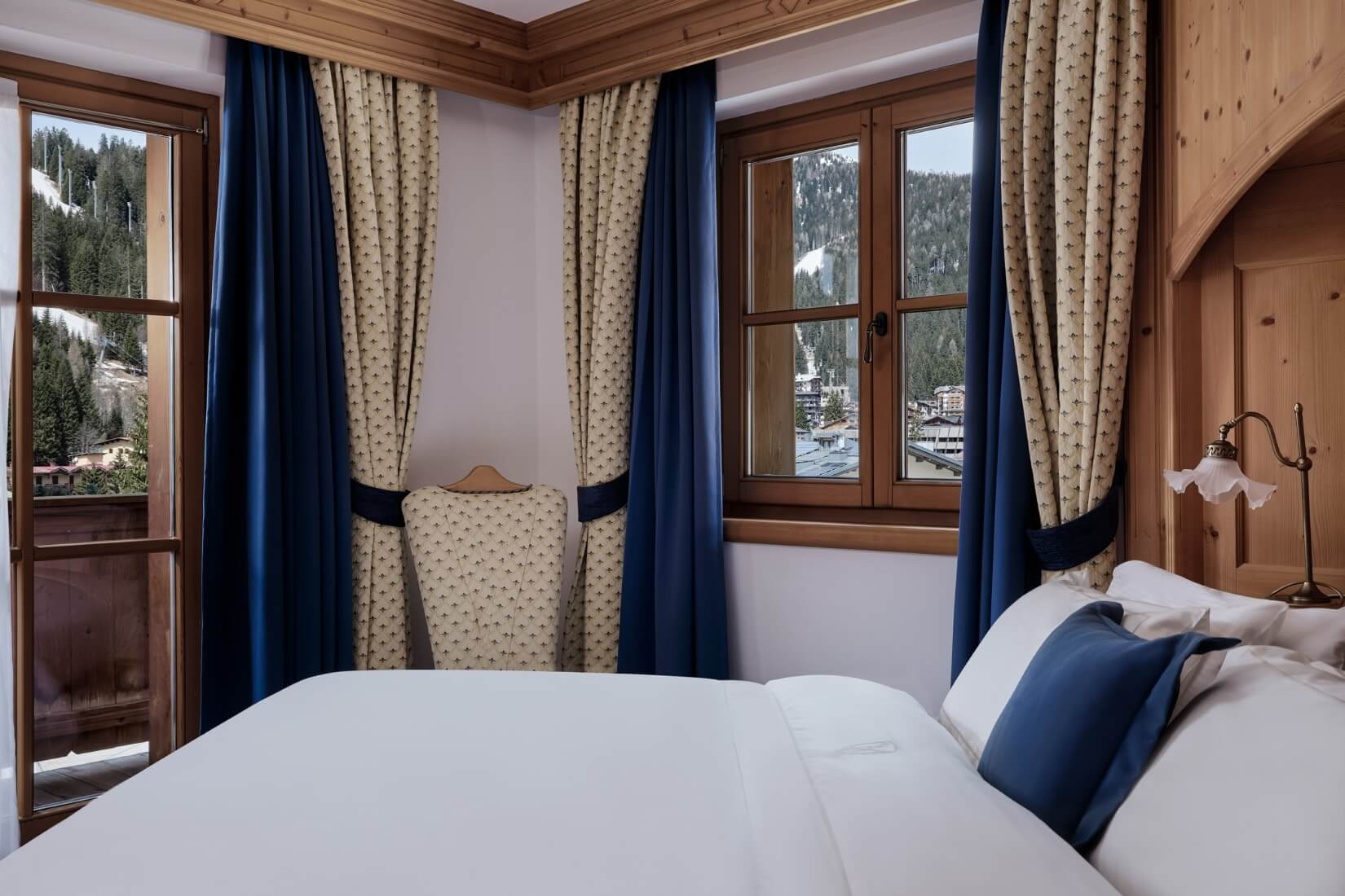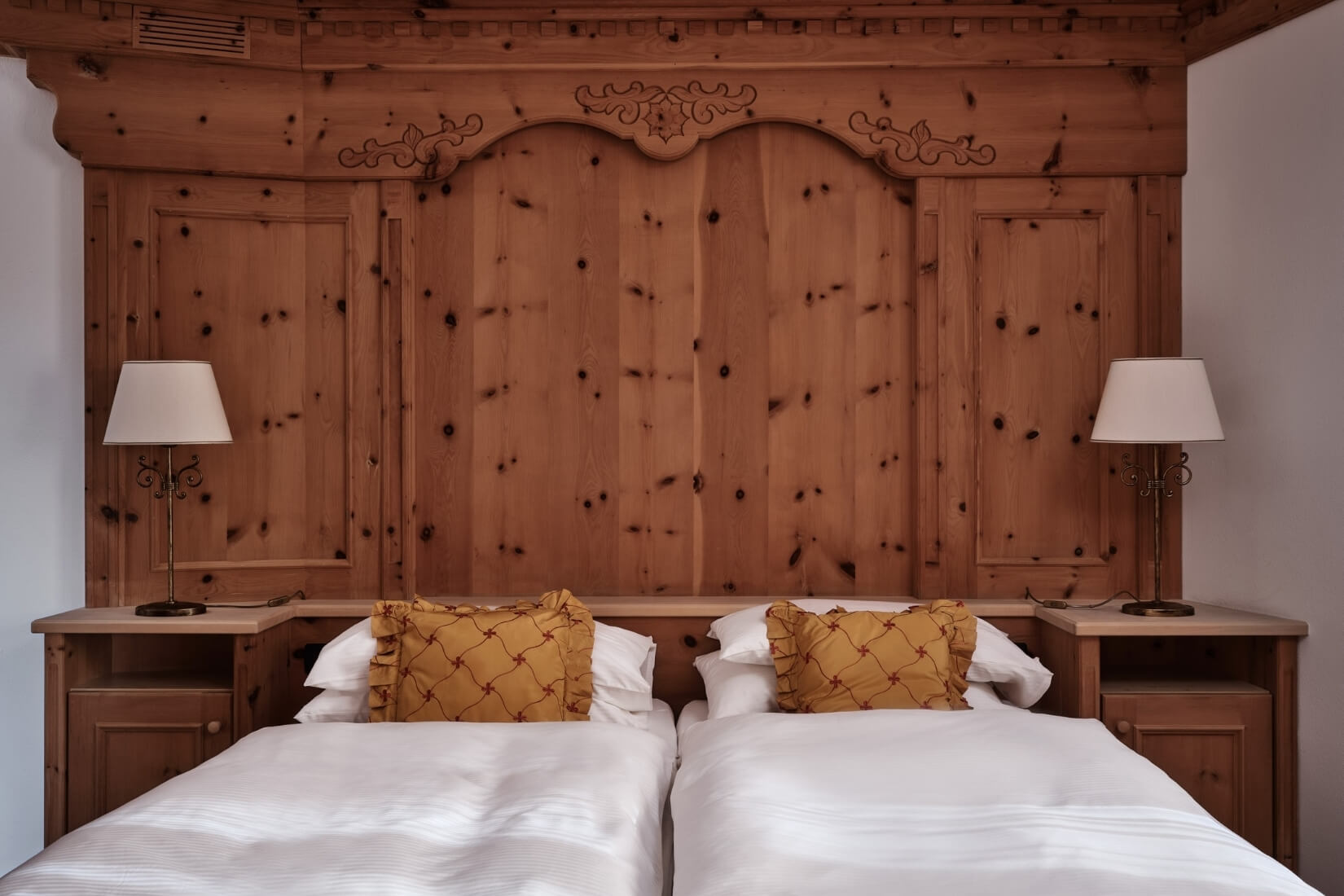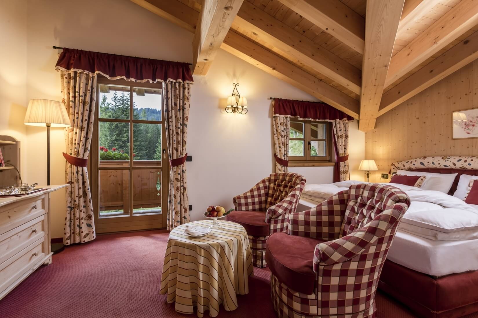 La Luxury Suite dei CICLAMINI, situata in mansarda, offre 50 mq di eleganza alpina, resa ancora più suggestiva dalle travi a vista in abete. La camera è composta da due stanze comunicanti.